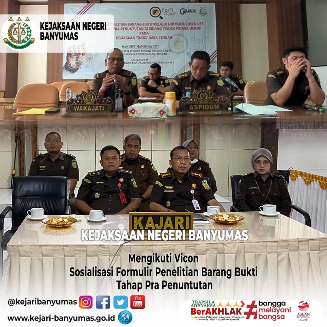 Banyumas. Selasa, 30 Juli 2024. Bertempat di Ruang Aula Kejaksaan Negeri Banyumas. Kepala Kejaksaan Negeri Banyumas (Dr. Adung Sutranggono, S.H., M.Hum.) Bersama Kepala Seksi Tindak Pidana Umum (Suwanto, S.H., M.H.) dan para Jaksa mengikuti Giat Vicon Sosialisasi Formulir Penelitian Barang Bukti Tahap Pra Penuntutan.