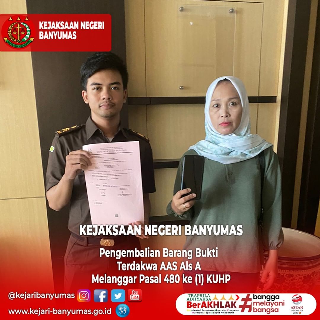 Banyumas. Rabu, 07 Agustus 2024. Bertempat di Kantor Kejaksaan Negeri Banyumas. Seksi Pengelolaan Barang Bukti dan Barang Rampasan Kejaksaan Negeri Banyumas melakukan pengembalian Barang Bukti atas nama terdakwa AAS Als A yang melanggar pasal 480 ke (1) KUHP.