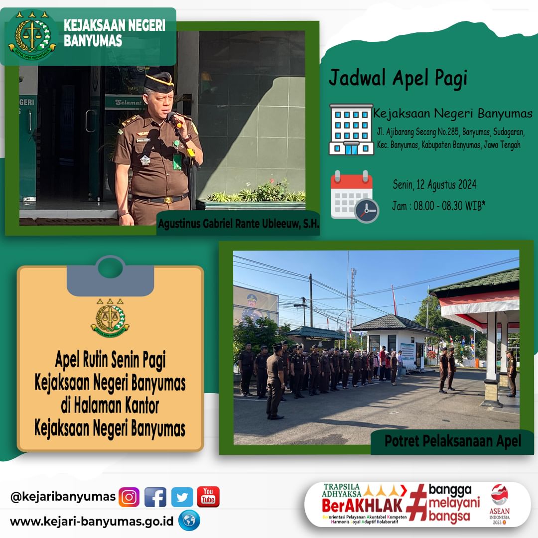 Banyumas. Senin, 12 Agustus 2024. Bertempat di Halaman Kantor Kejaksaan Negeri Banyumas. Kepala Seksi Intelijen (Agustinus Gabriel Rante Ubleeuw, S.H.) menerima Apel Pagi yang diikuti oleh Seluruh Pegawai Kejaksaan Negeri Banyumas dan PPNPN dilanjutkan dengan Pembacaan Core Values BERAKHLAK dan Pengucapan Tri Krama Adhyaksa.
