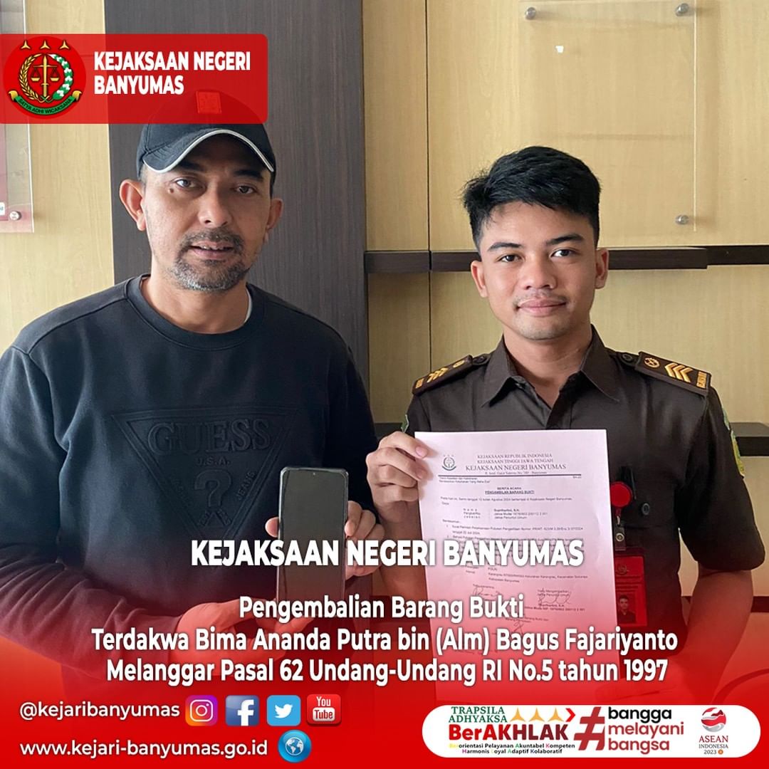 Banyumas. Senin, 12 Agustus 2024. Bertempat di Kejaksaan Negeri Banyumas. Telah dilaksanakan pengembalian Barang bukti atas nama terpidana Bima Ananda Putra bin (Alm) Bagus Fajariyanto berupa 1(satu) unit handphone merk Realme warna Hitam yang melanggar Pasal 62 Undang-Undang RI No.5 tahun 1997.