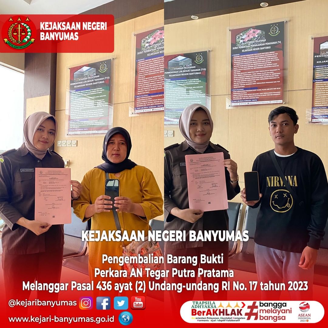 Banyumas. Selasa, 13 Agustus 2024. Bertempat di Kejaksaan Negeri Banyumas, Seksi Pengelolaan Barang Bukti dan Barang Rampasan Kejaksaan Negeri Banyumas melakukan pengembalian Barang Bukti dalam Perkara an Tegar Putra Pratama yang melanggar pasal 436 ayat (2) Undang-undang Republik Indonesia Nomor 17 tahun 2023 tentang kesehatan.