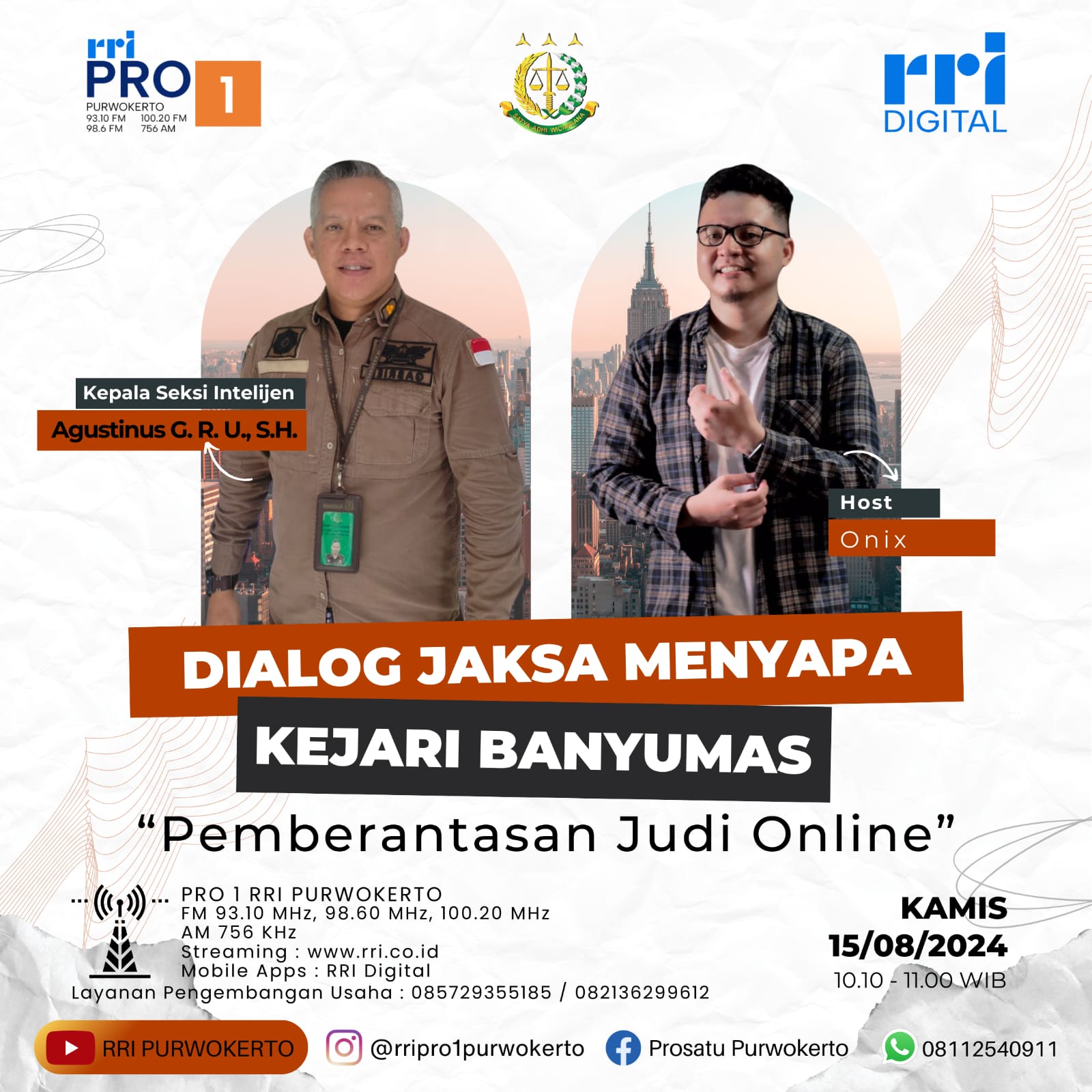 Banyumas. Kamis, 15 Agustus 2024. Bertempat di Kantor RRI Purwokerto. Kepala Seksi Intelijen (Agustinus Gabriel Rante Ubleeuw, S.H.) menjadi Narasumber dalam giat Dialog Jaksa Menyapa yang dilaksanakan di Kantor RRI Purwokerto. Adapun Tema yang dibahas yaitu “Pemberantasan Judi Online”.