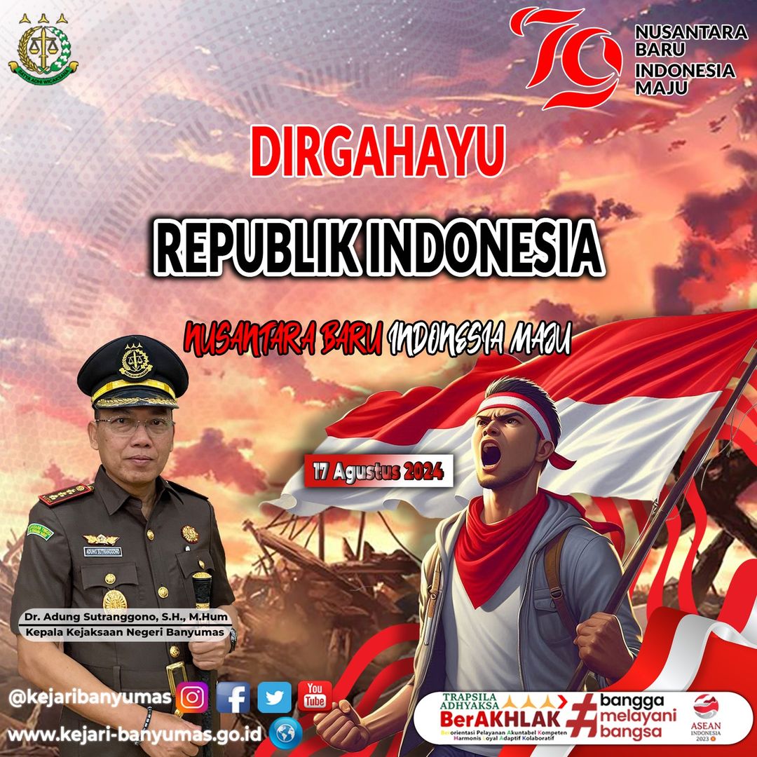 Kepala Kejaksaan Negeri Banyumas (Dr. Adung Sutranggono, S.H., M.Hum) beserta seluruh jajaran mengucapkan Dirgahayu Republik Indonesia Ke – 79.