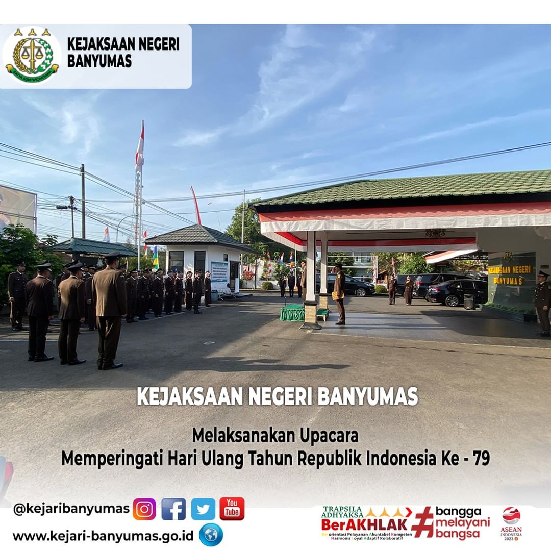 Banyumas. Sabtu, 17 Agustus 2024. Bertempat di Halaman Kantor Kejaksaan Negeri Banyumas. Seluruh Pegawai Kejaksaan Negeri Banyumas melaksanakan Upacara memperingati Hari Ulang Tahun Republik Indonesia Ke-79. Adapun selaku Inspektur Upacara yaitu Kepala Seksi Intelijen (Agustinus Gabriel Rante Ubleeuw, S.H.